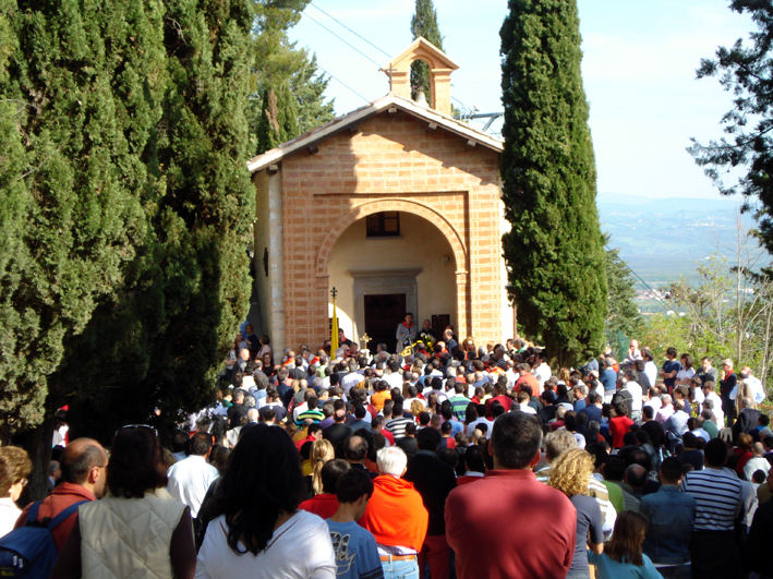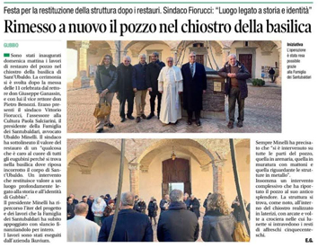 Iniziative realizzate: in modo particolare si ricordano: il locale sottostante la chiesetta di S. Giuliano (1970-73); il locale nei pressi dell'antica Porta Tessenaca, in via Piccardi n° 21 [attualmente sede del Ristorante "Il Campanone"] (1974-75); il locale sottostante la Casa di S. Ubaldo (1976-81) e l'attuale taverna di Via Angela Ubaldini n° 3, i cui locali sono di proprietà della Famiglia. ![]() La statua ricorda a tutti coloro che provengono da Perugia che stanno entrando nella comune e nella diocesi di S.Ubaldo.